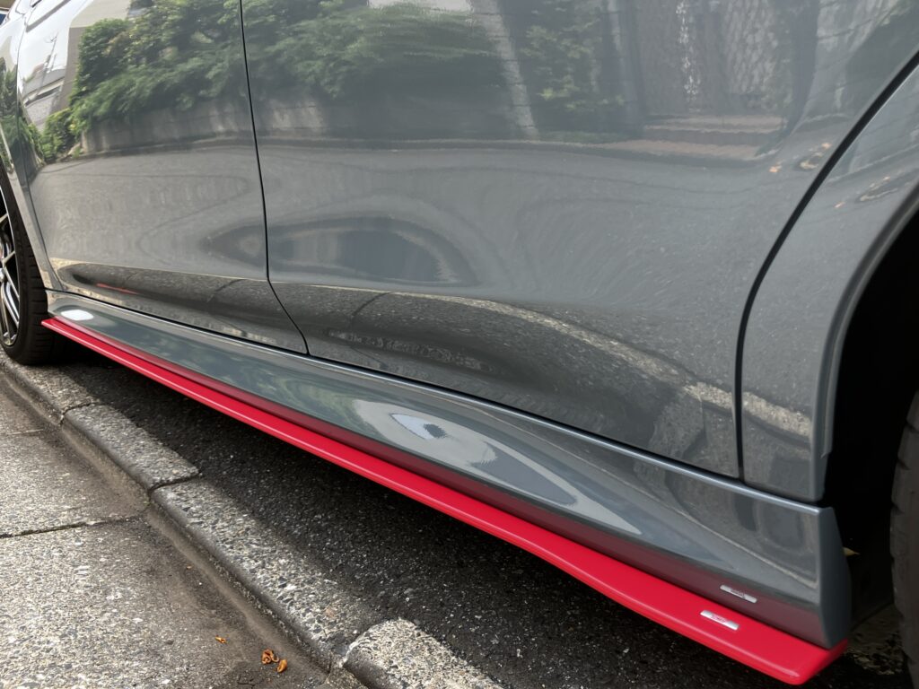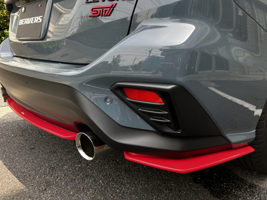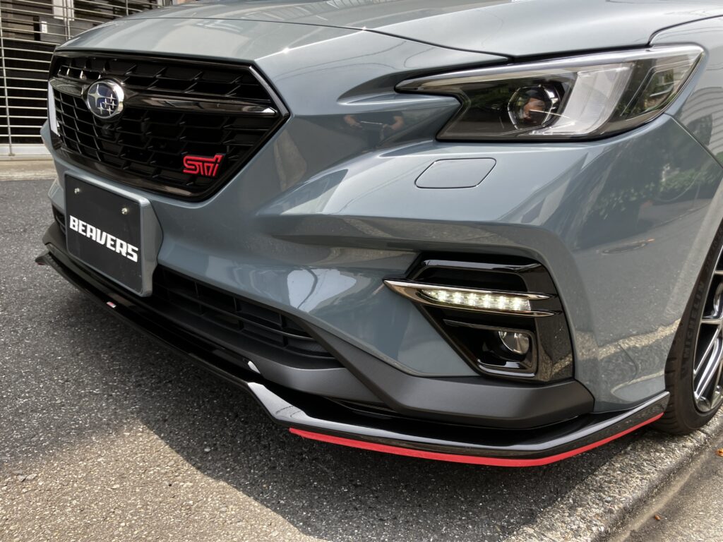 STIフロントアンダースポイラーにチェリーレッドのスカートリップ 専用ダークメッキのLEDアクセサリーライナー