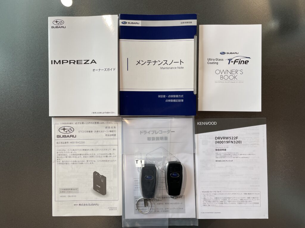 新車時保証書や取扱い説明書、スペアキーなどの揃っています。新車時のコーティング施工証明書もあります。コーティングメンテナンスキットもあります。