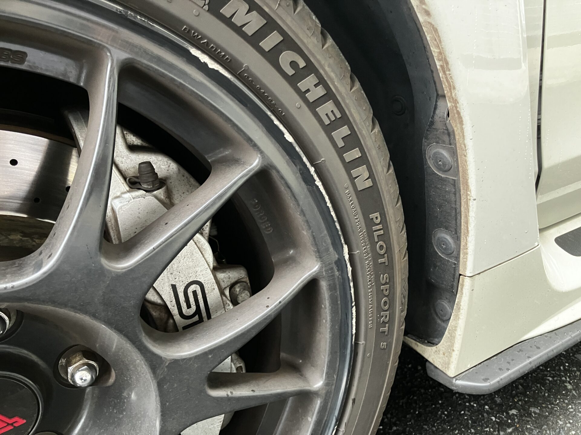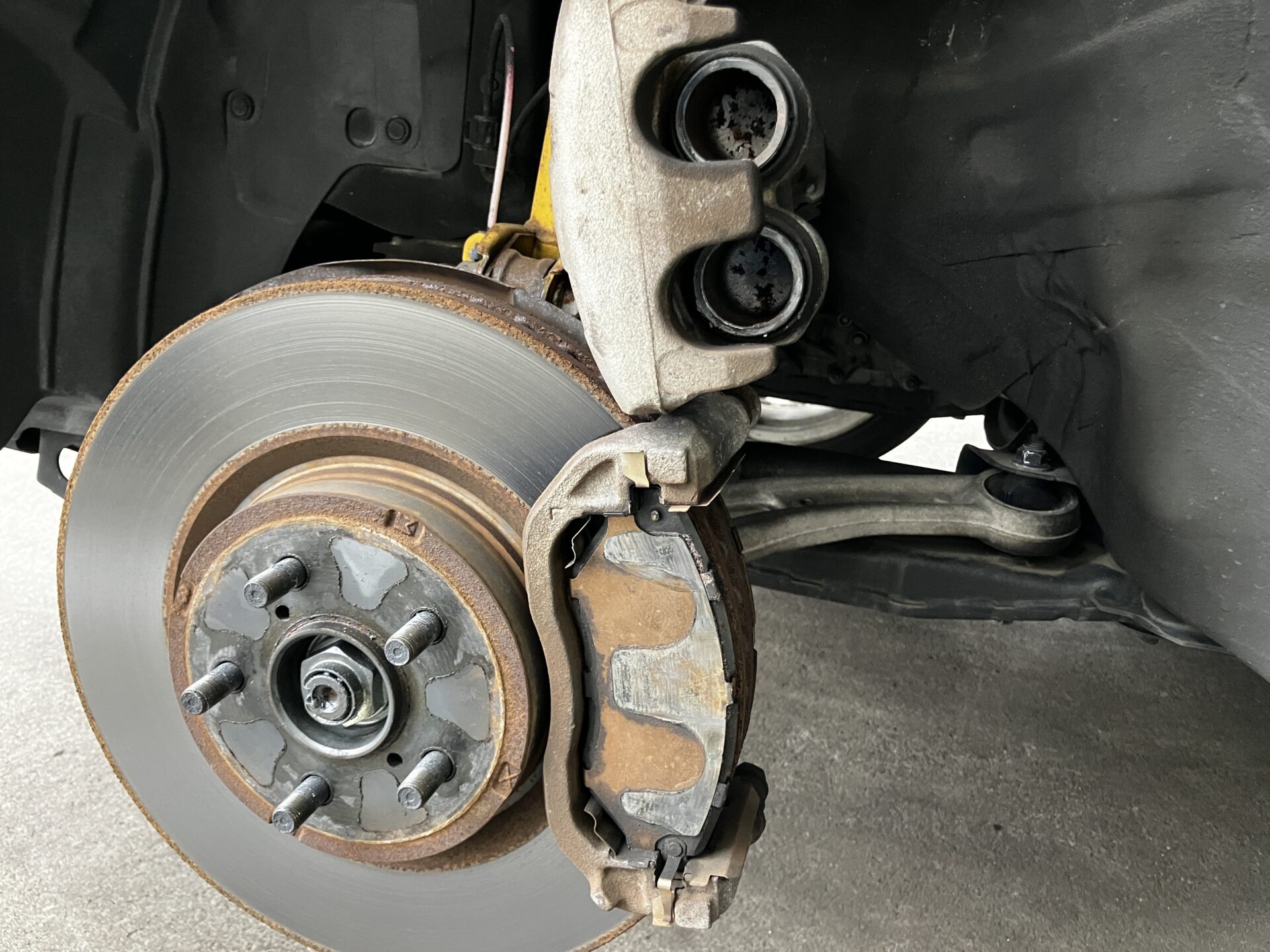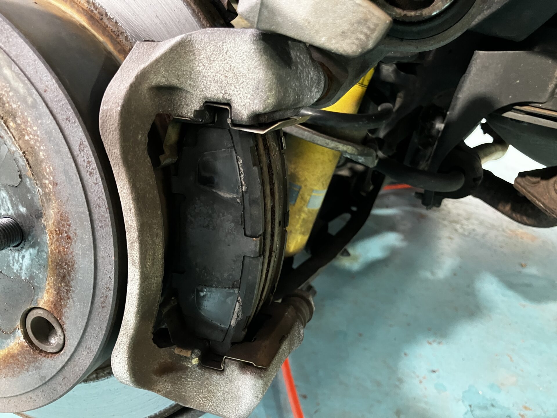 リヤブレーキも確認します。残量は6㎜の残量でした。その他ブーツ切れ等もなく問題はありません。タイヤをローテーションして取り付けました。