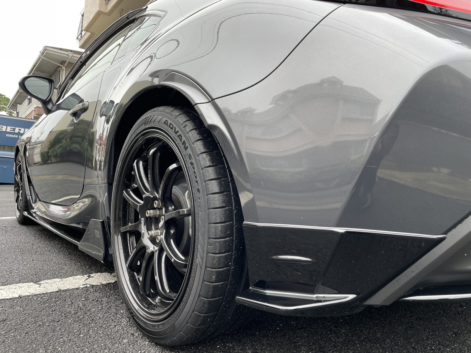 サイドスポイラーはトムスのサイドスポイラーをグロスブラックに塗装し装着されています。STIパフォーマンスのサイドは純正サイドシルスポイラーの後方に小さいのが装着されるだけの為、トムスの方がインパクトが良いと思います。この手があったか!と思いました。
