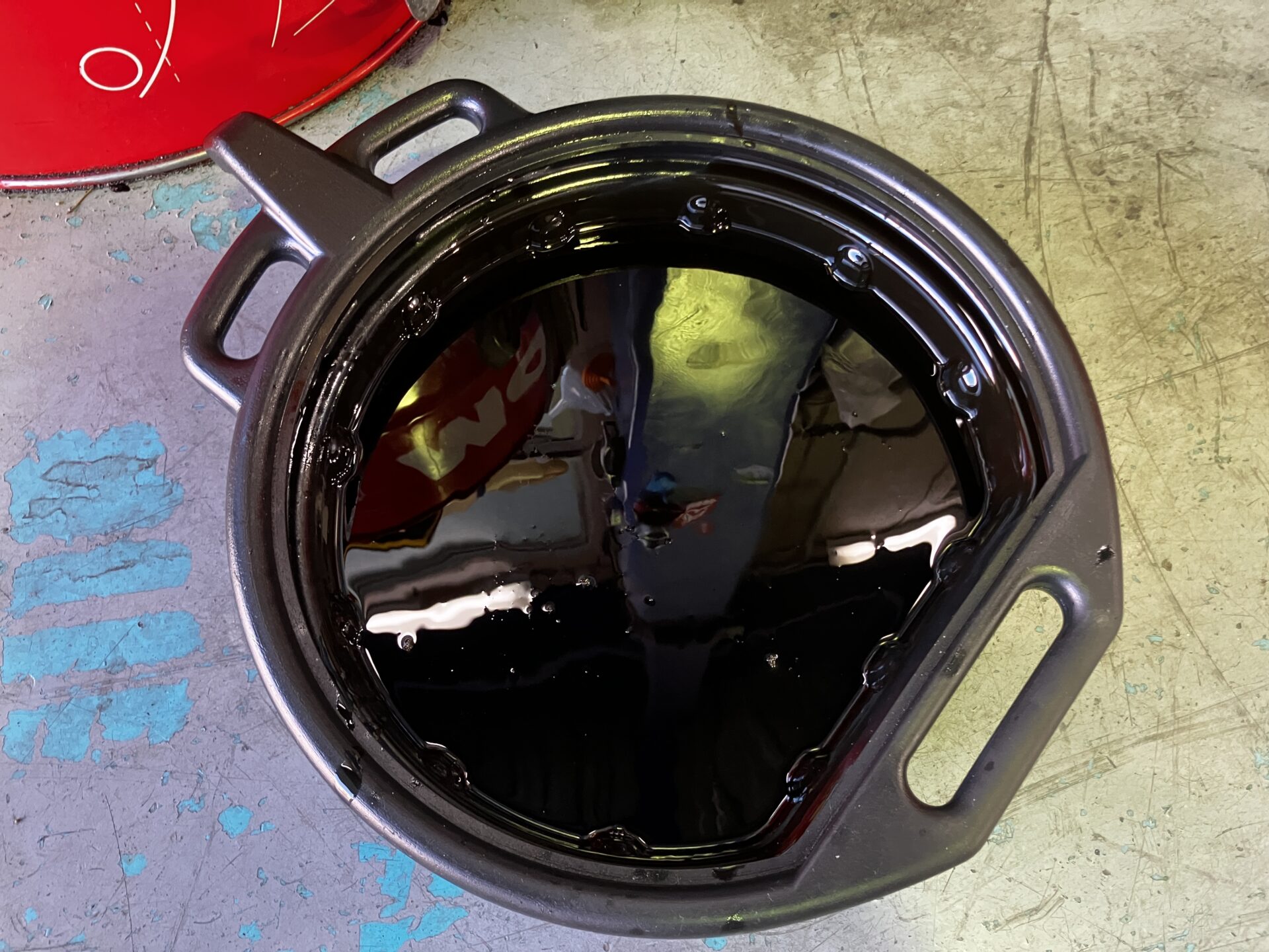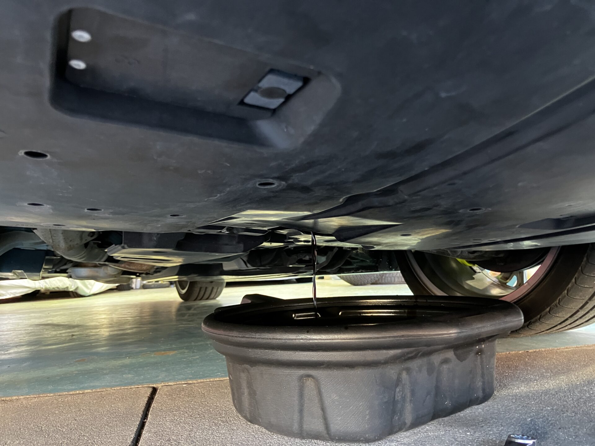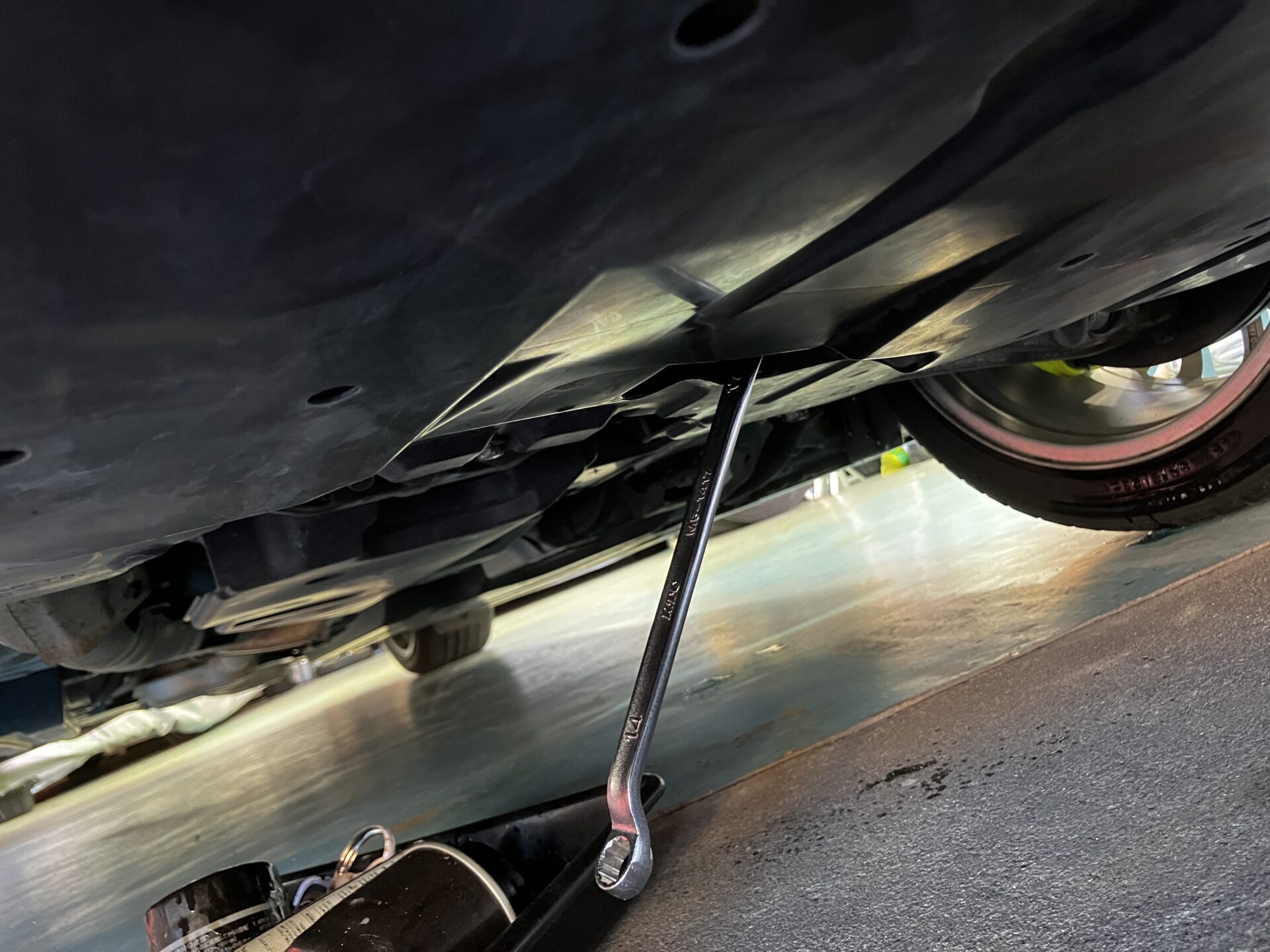 下からエンジンオイルを抜いておきます。抜いている間にタイヤの付け替えをします。